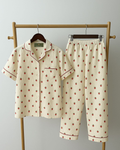Sleep in style and comfort with this adorable cream pajama set featuring a playful strawberry print. Designed with a classic short-sleeve button-down shirt and matching elastic-waist pants, this set combines cuteness with comfort. The contrasting red piping along the collar, pocket, sleeves, and hemline adds a chic finishing touch. Crafted from soft, breathable cotton, its perfect for cozy nights, lounging at home, or relaxed weekend mornings.